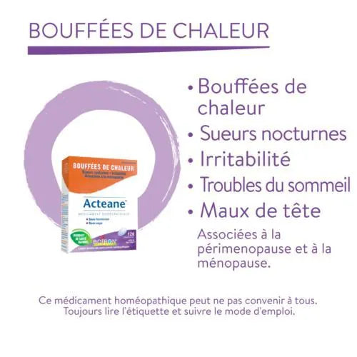 Médicament homéopathique utilisé pour le soulagement des symptômes de la périménopause et de la ménopause tels que les bouffées de chaleur, les sueurs nocturnes, les troubles du sommeil, les maux de tête, l’irritabilité et l’humeur changeante.