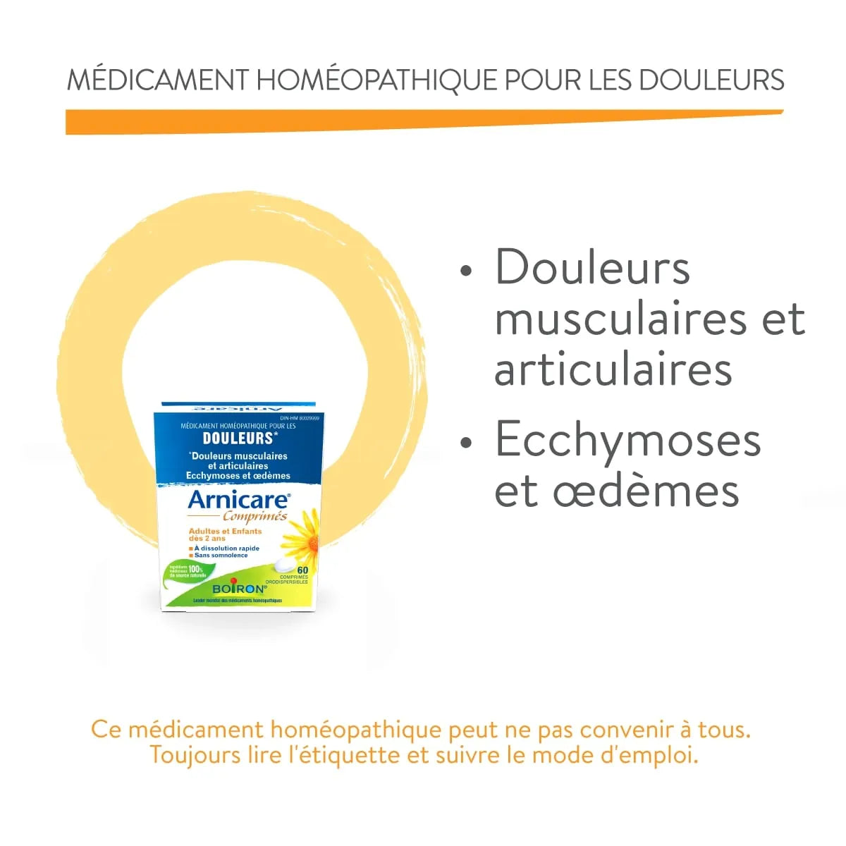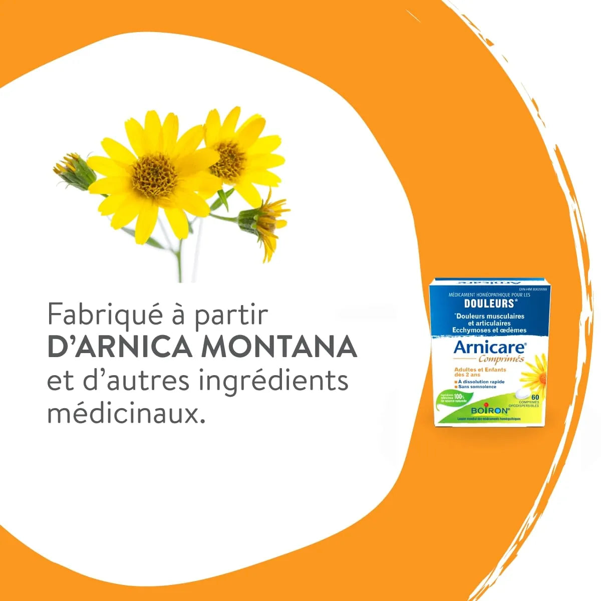 Médicament homéopathique qui soulage les douleurs musculaires et articulaires. Facilite la résorption des ecchymoses et œdèmes inflammatoires causés par un traumatisme (chute, coup, intervention chirurgicale).
