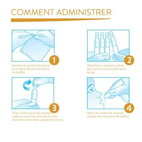 Enfants de 1 mois à 11 ans :L’enfant doit avaler le médicament.Donner 1 unidose buvable dès les premiers symptômes, 3 fois par jour.Espacer les prises suivant amélioration. Conserver les unidoses non utilisées dans le sachet d’aluminium.Sans précautions particulières de conservation avant l’ouverture du sachet.