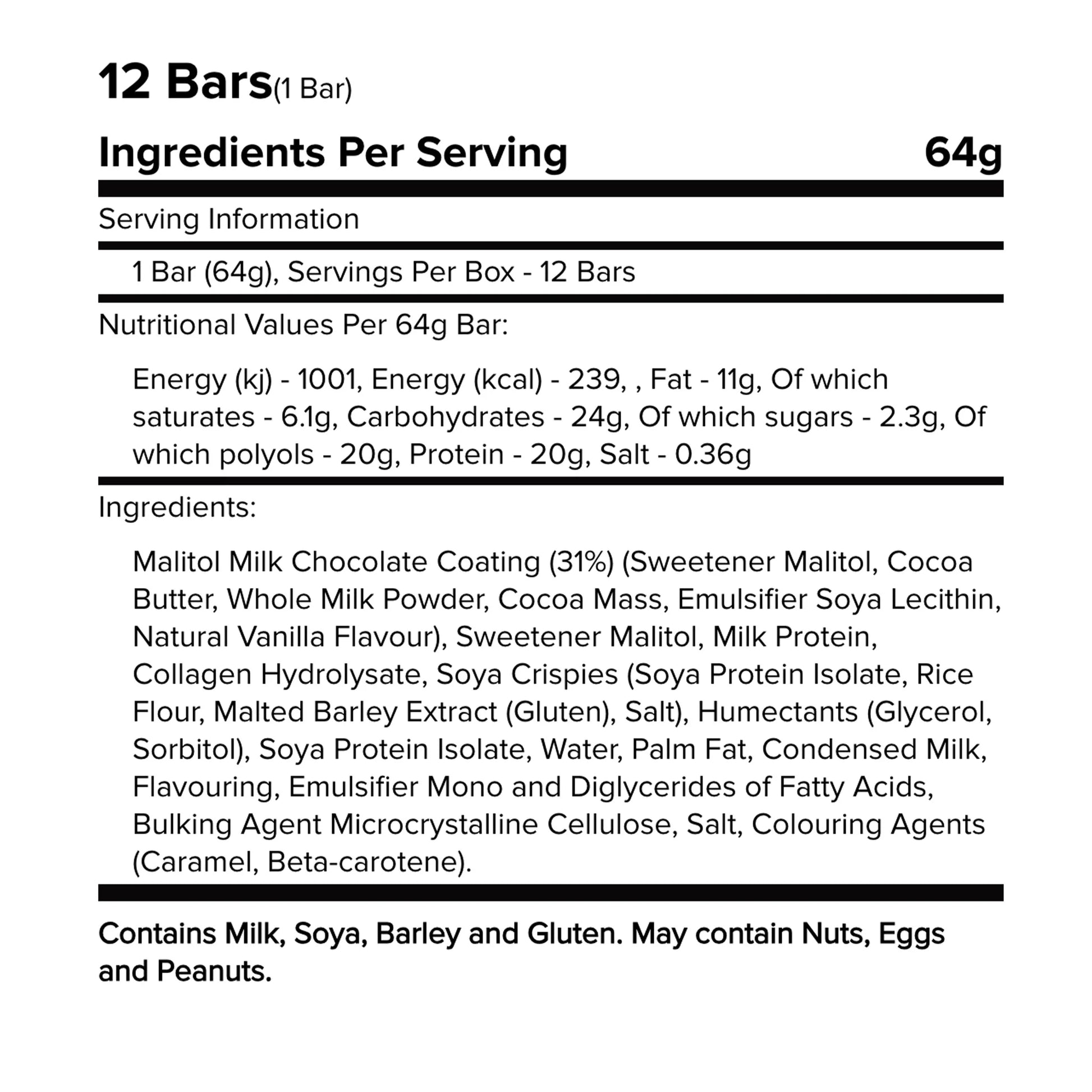 - Protéine de lait isolée - Chocolat au lait - Maltitol, sucralose - Gomme de guar, acide citrique - Arômes naturels