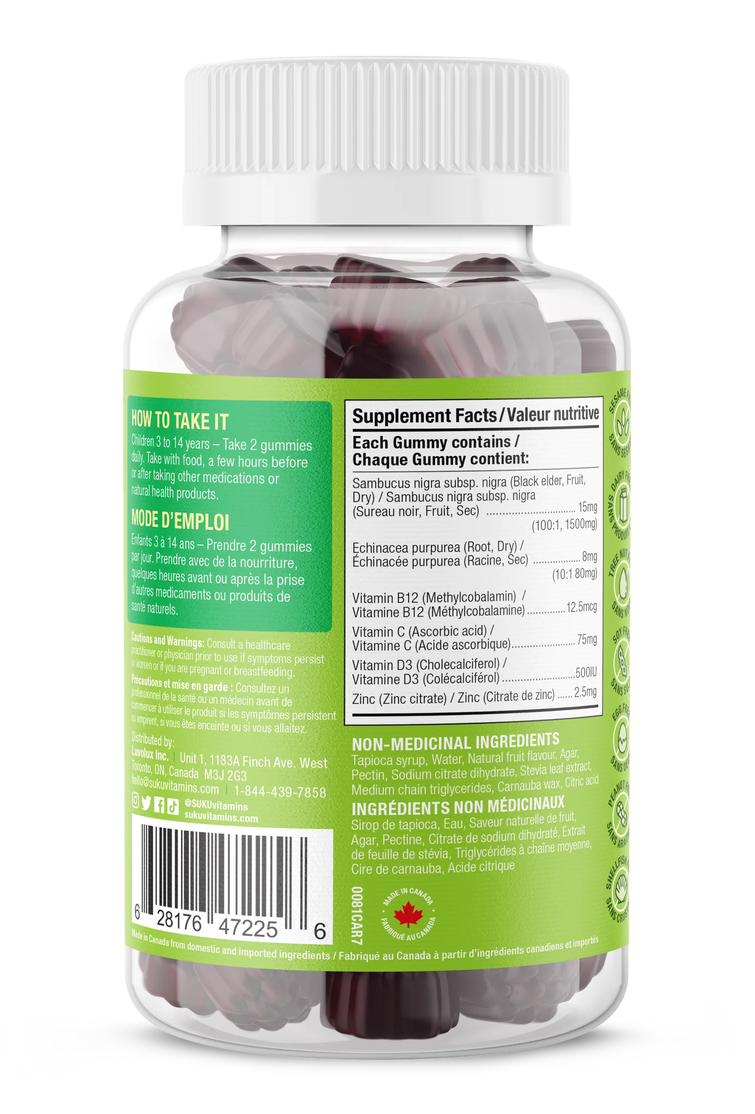 - Assurez la santé immunitaire de vos enfants avec ces gommes sans sucre contenant elderberry, échinacée, zinc, vitamines C, D et B12.