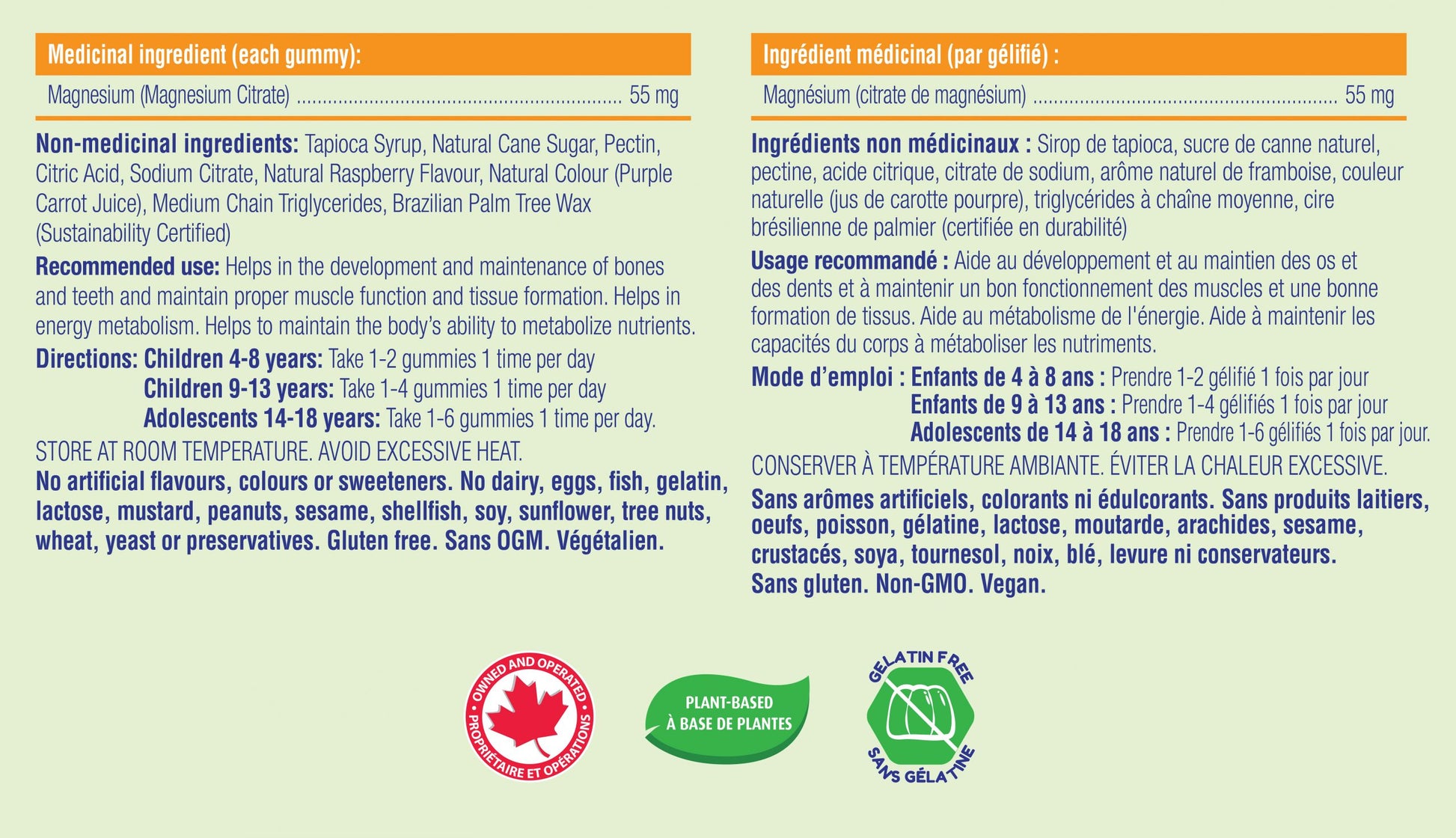 Formule végétalienne et végétarienne, exempte de gélatine animale, sucre ajouté, colorants ou saveurs artificiels, gluten, produits laitiers, œufs, poissons, soja, noix, levure, sulfites, sésame, moutarde, crustacés, blé ou allergènes courants. Fabriquée au Canada dans une installation agréée par Santé Canada et la FDA pour garantir qualité et sécurité.