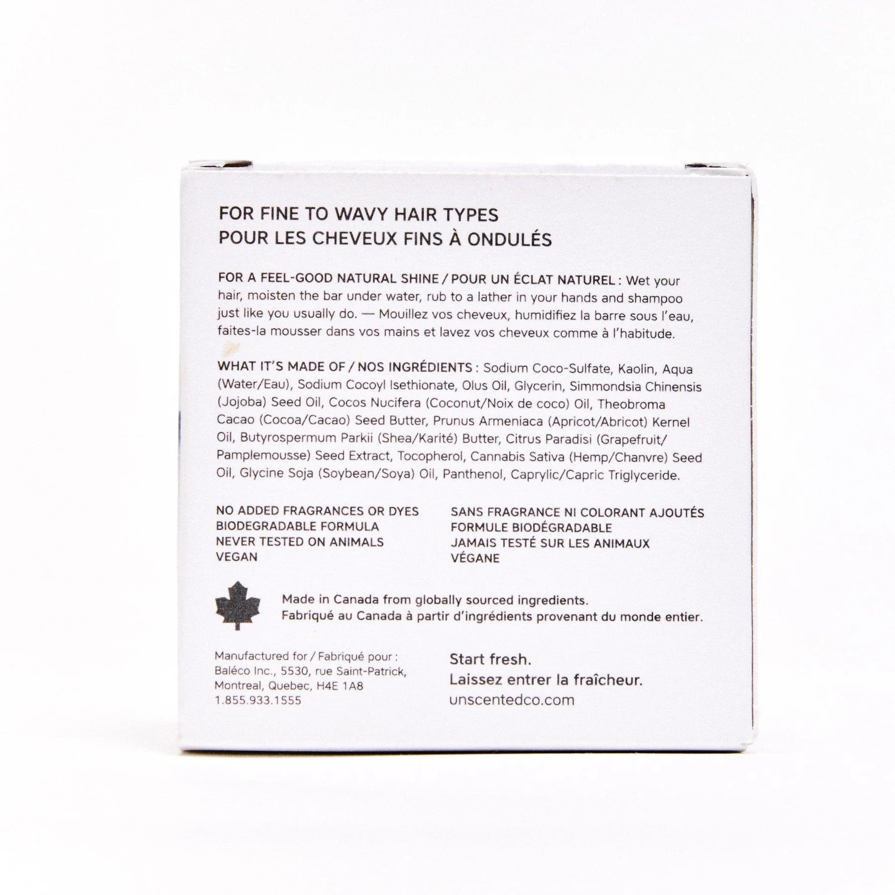 - Ingrédients principaux : Sodium Coco Sulfate, Kaolin, Sodium Cocoyl Isethionate, Olus Oil, Glycerin, Simmondsia Chinensis (Jojoba) Seed Oil, Cocos Nucifera (Coconut) Oil, Theobroma Cacao (Cocoa) Seed Butter, Prunus Armeniaca (Apricot) Kernel Oil, Butyrospermum Parkii (Shea) Butter, Citrus Paradisi (Grapefruit) Seed Extract, Tocopherol, Cannabis Sativa (Hemp) Seed Oil, Glycine Soja (Soybean) Oil, Panthenol, Caprylic/Capric Triglyceride