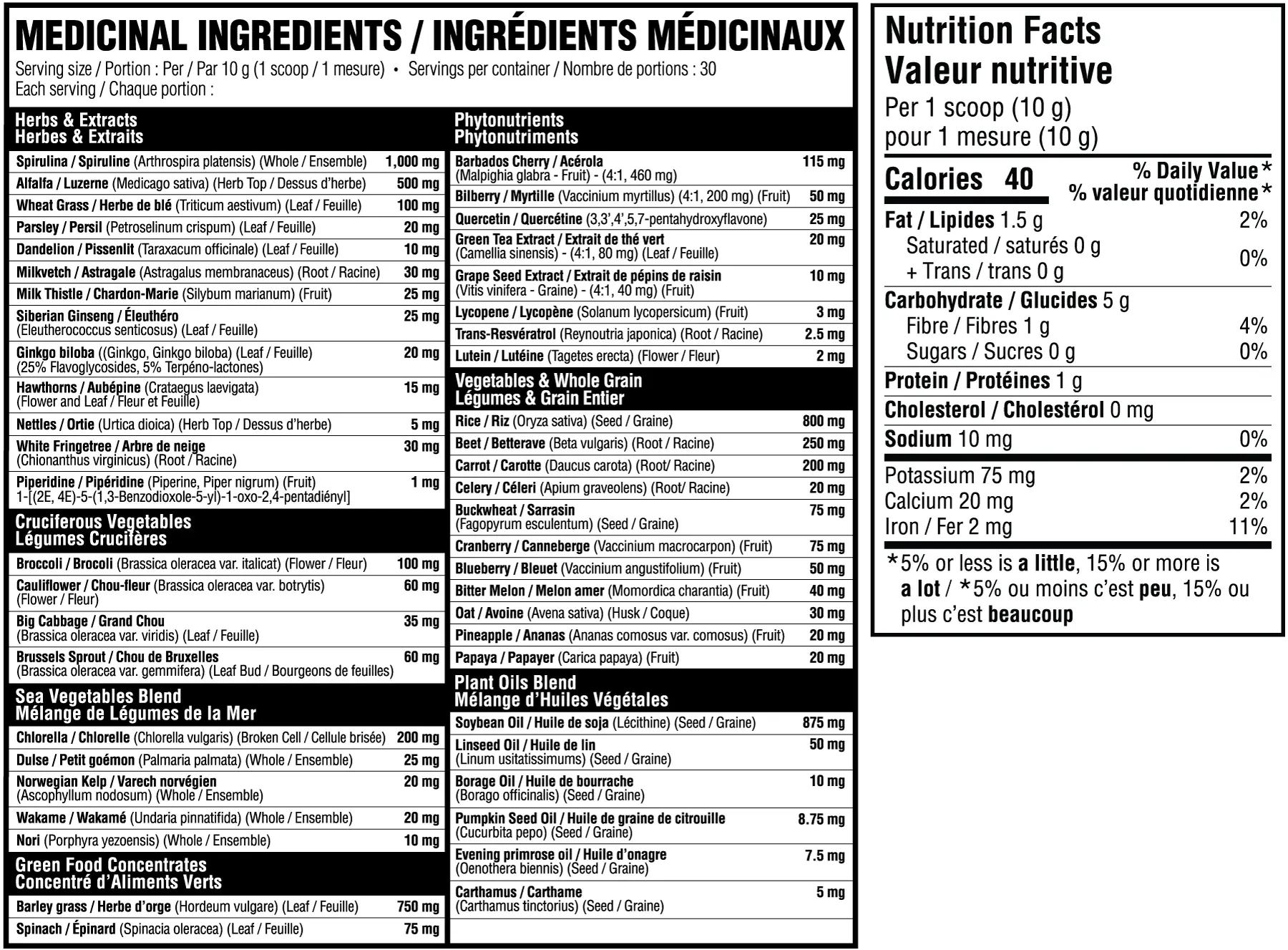 - 1 portion par jour — à mélanger avec de l'eau ou dans un smoothie, selon le besoin d'un apport en super-aliments.